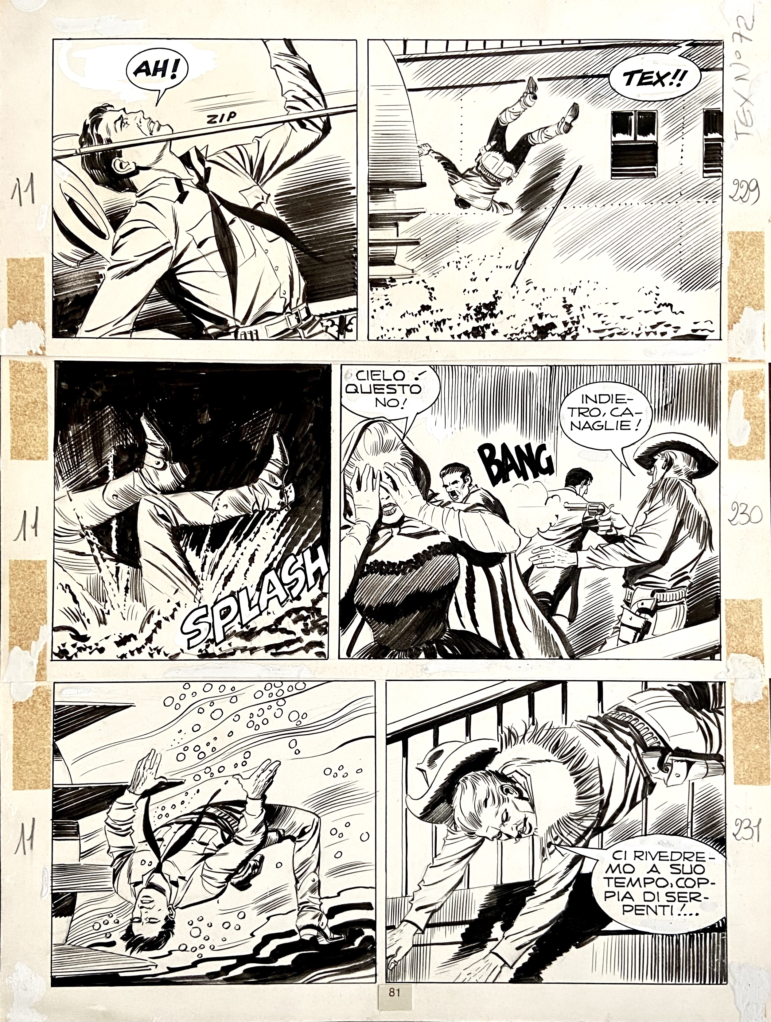 | Descrizione | Tavola originale per Tex. Cm. 25x33,5. China su cartoncino. Tre strisce assemblate. Codice 1981. | |