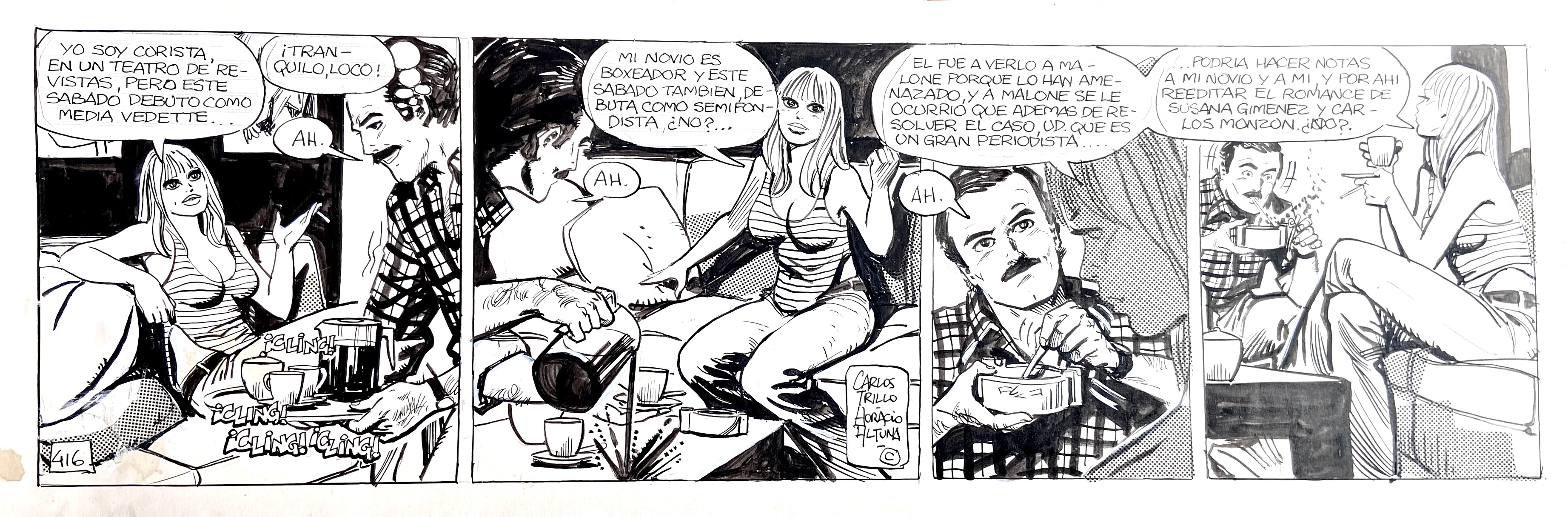 | Descrizione | Striscia originale per Loco Chavez n. 416. Cm. 40,5x13,5. China su cartoncino. Firmata. Codice 2185. | |
