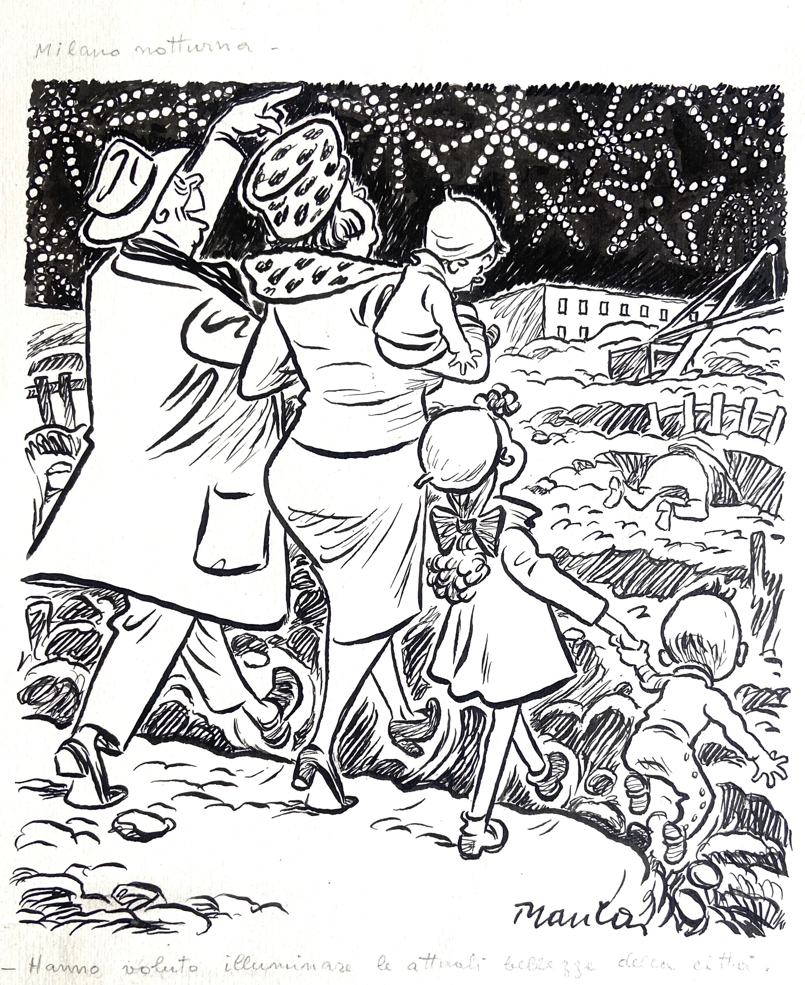 | Descrizione | Illustrazione originale cm. 25,5x30. "Milano notturna". China su cartoncino. Firmata. Codice 1777. | |