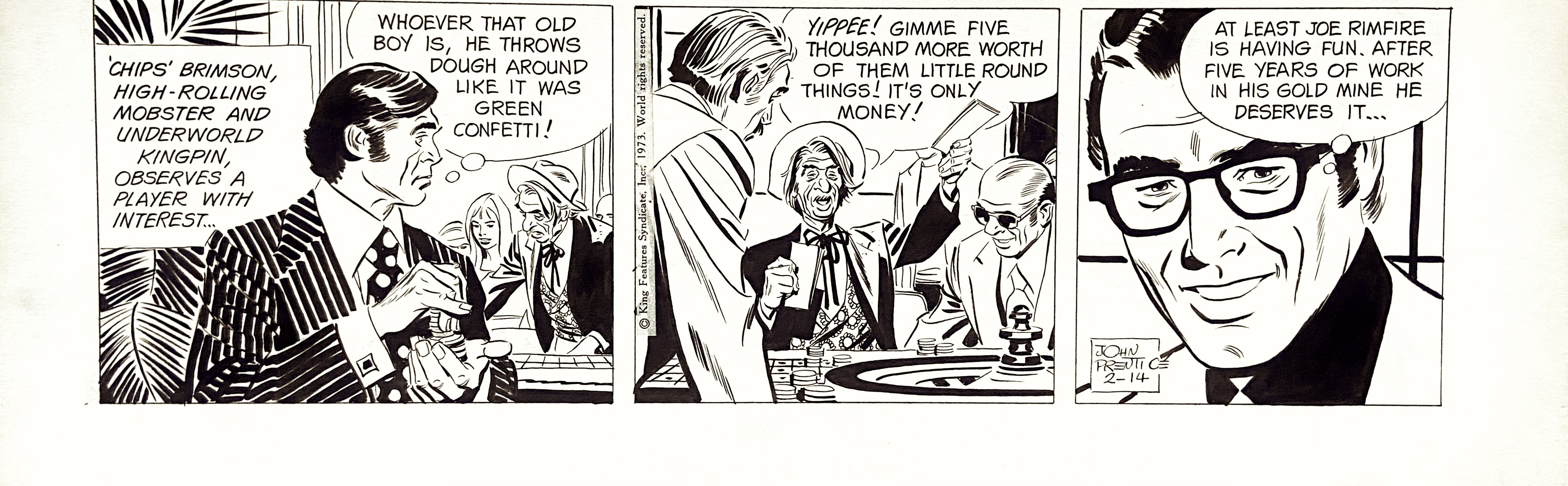 Descrizione | Striscia originale per Rip Kirby. 2-14. 1973. Cm. 51,5x17. China su cartoncino. Firmata. Codice 1926. | |