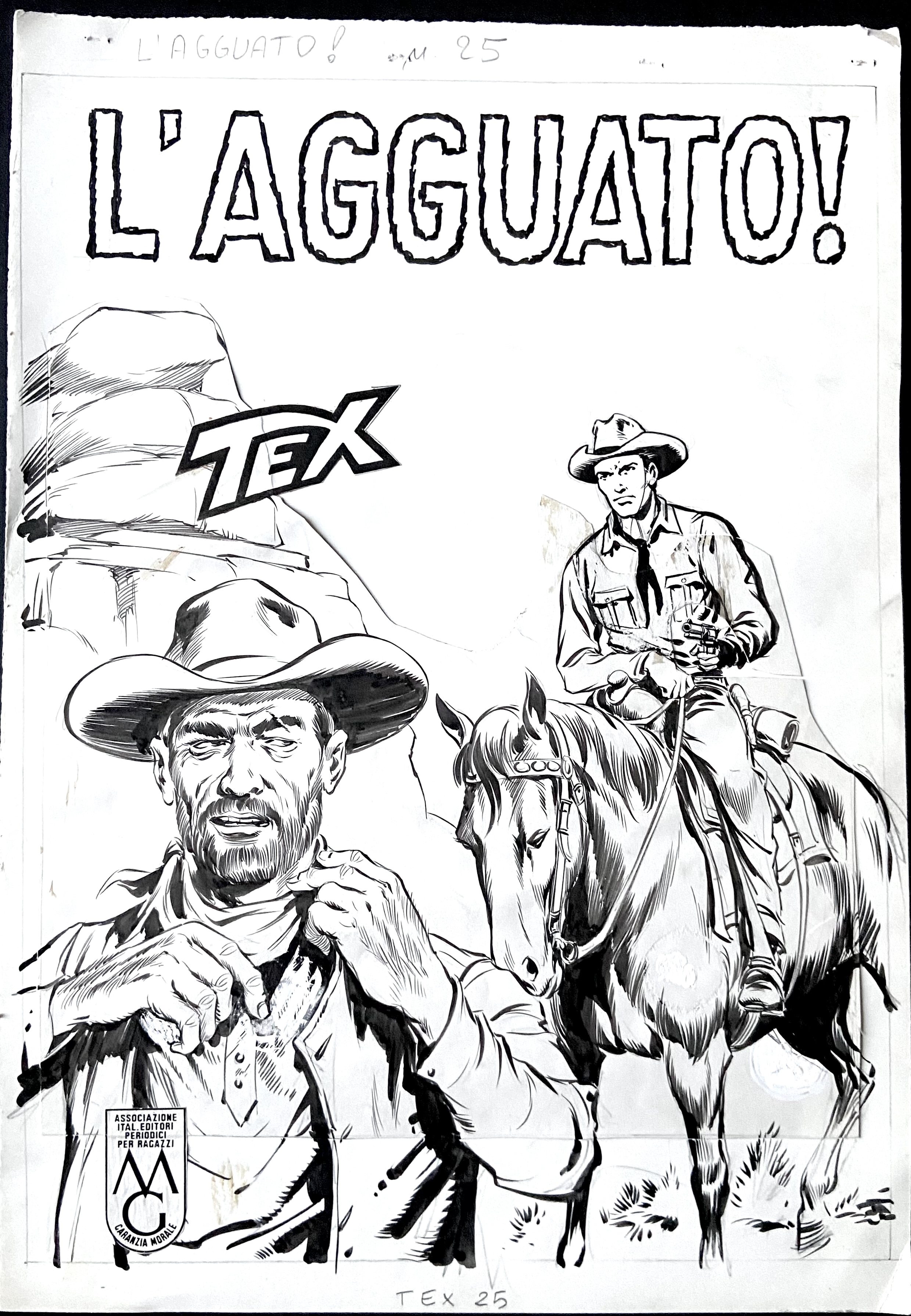 | Descrizione | Copertina originale per Tex n. 25 "L'agguato". Cm. 25,5x36,5. China su cartoncino. Parzialmente rimontata. Timbrata sul retro (il timbro garantisce la provenienza diretta dall'archivio Eredi Galleppini). Codice 2029. | |