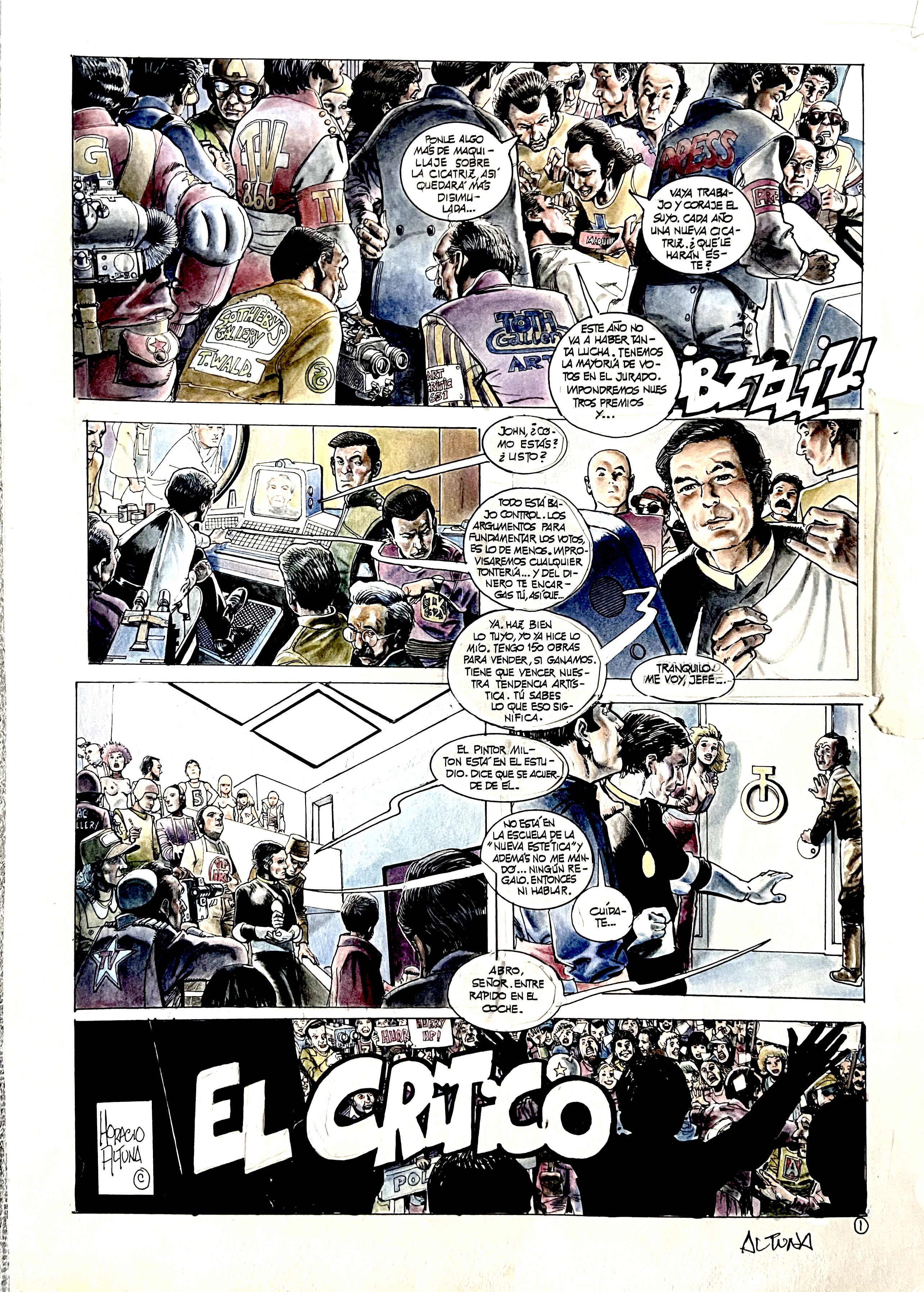 | Descrizione | Tavola originale per Ficcionario. Cm. 26,5x37,5. Tecnica mista su cartoncino. La seconda vignetta a destra applicata. Firmata e timbrata. Codice 2128. | |