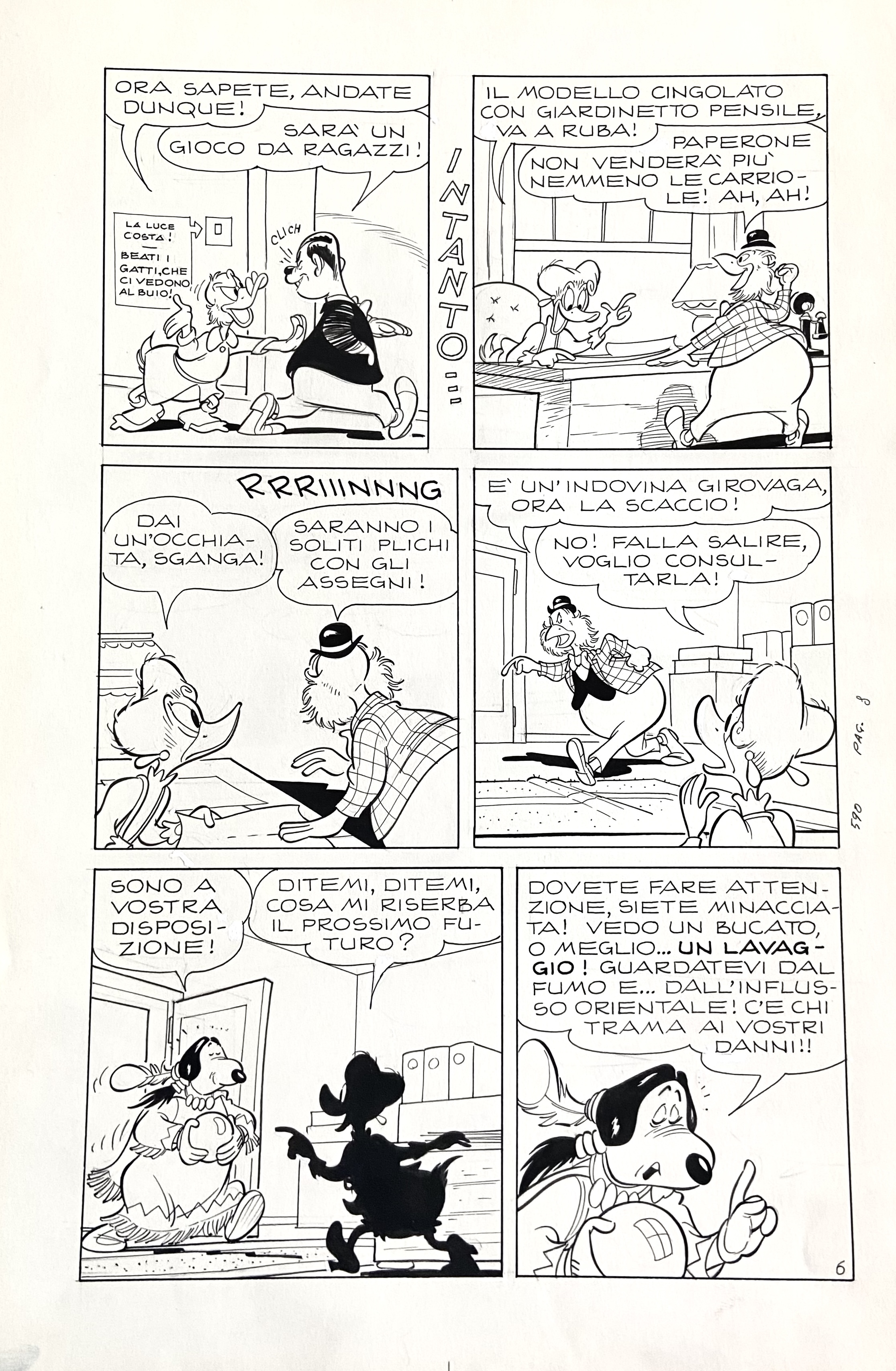 | Descrizione | Tavola originale pubblicata su Topolino n. 590. Cm. 25x36,5. China su cartoncino. Codice 2166. | |